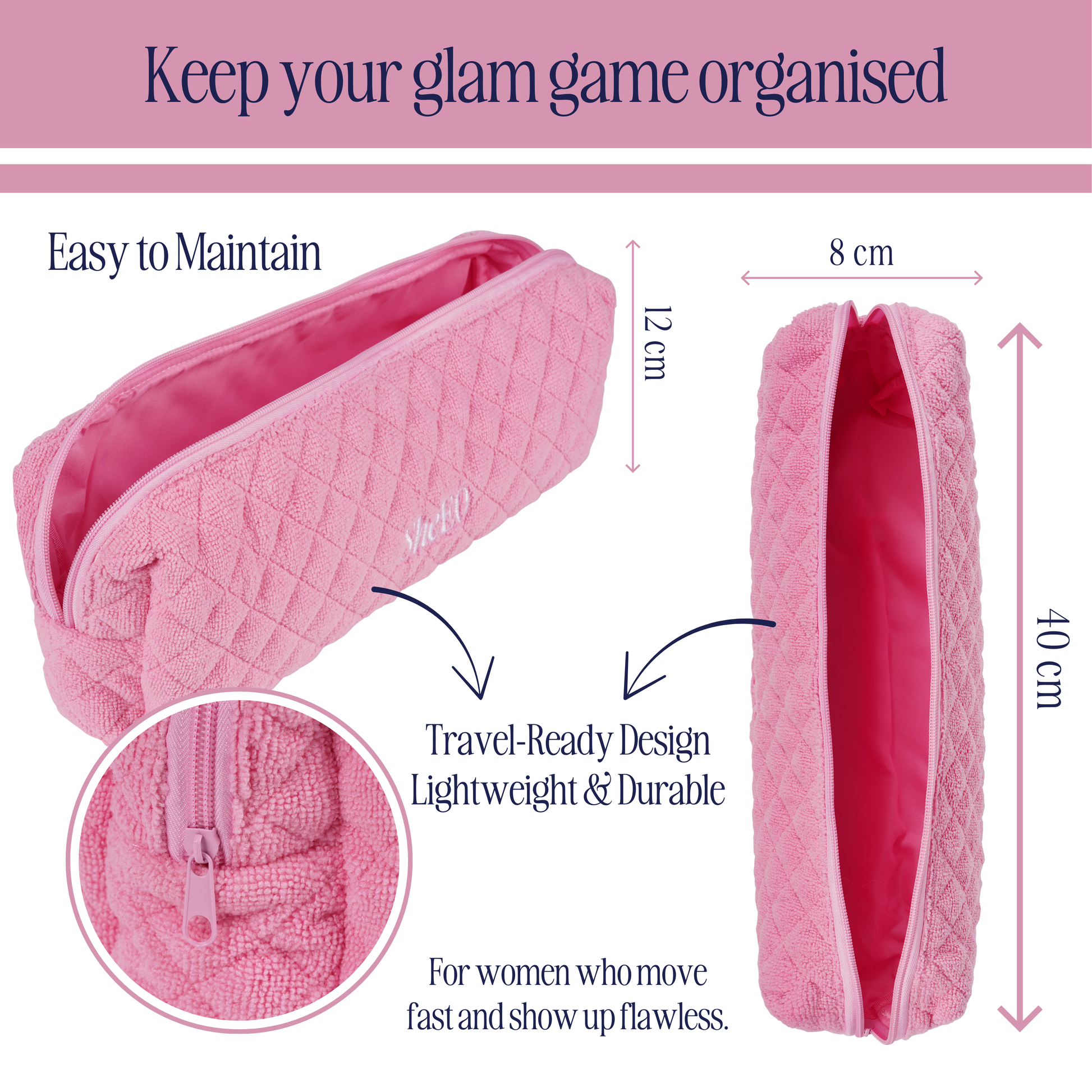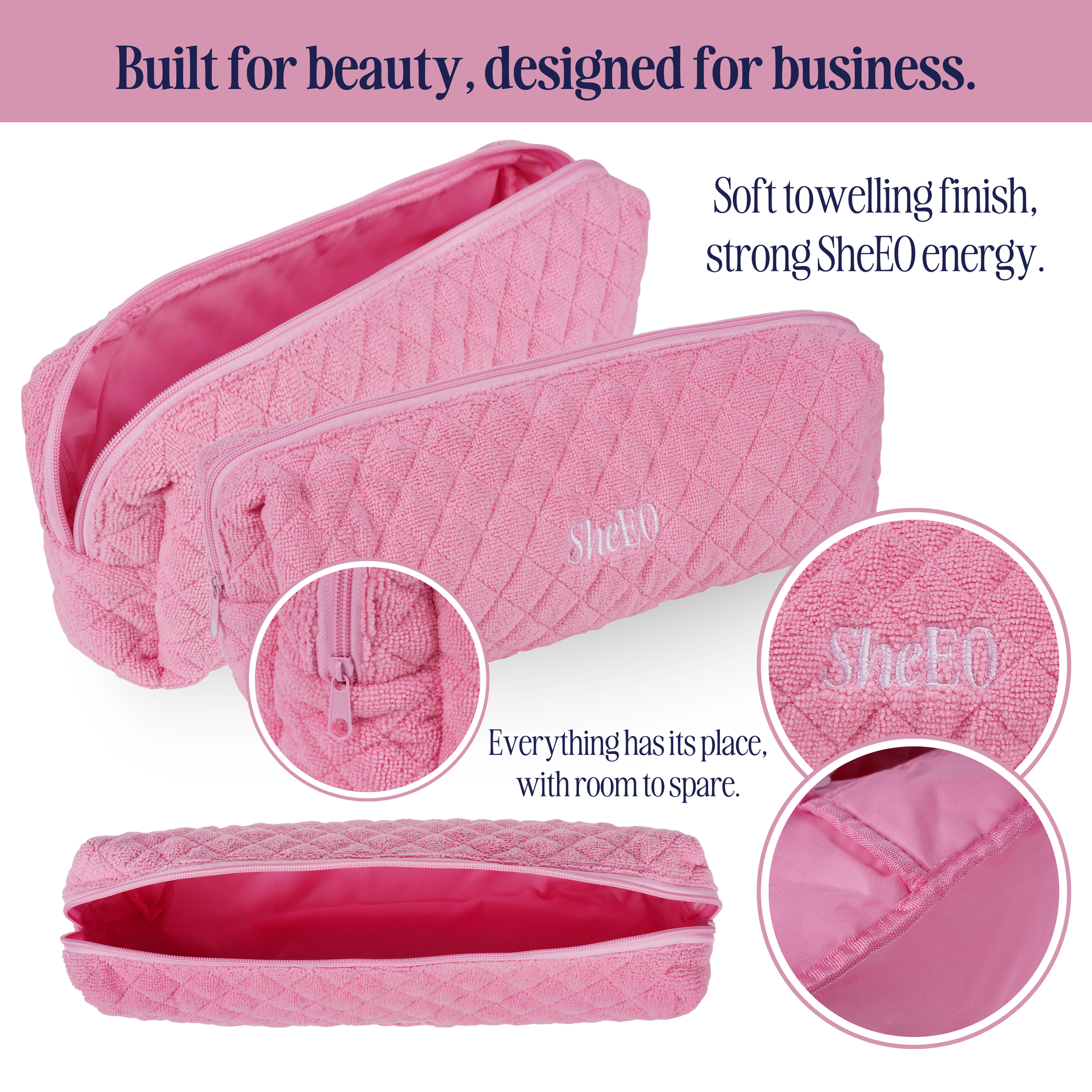 Designed in signature blush pink towelling and finished with the embroidered SheEO logo, itβs stylish enough to sit pretty on your shelf, and practical enough to throw in your case for a weekend away.