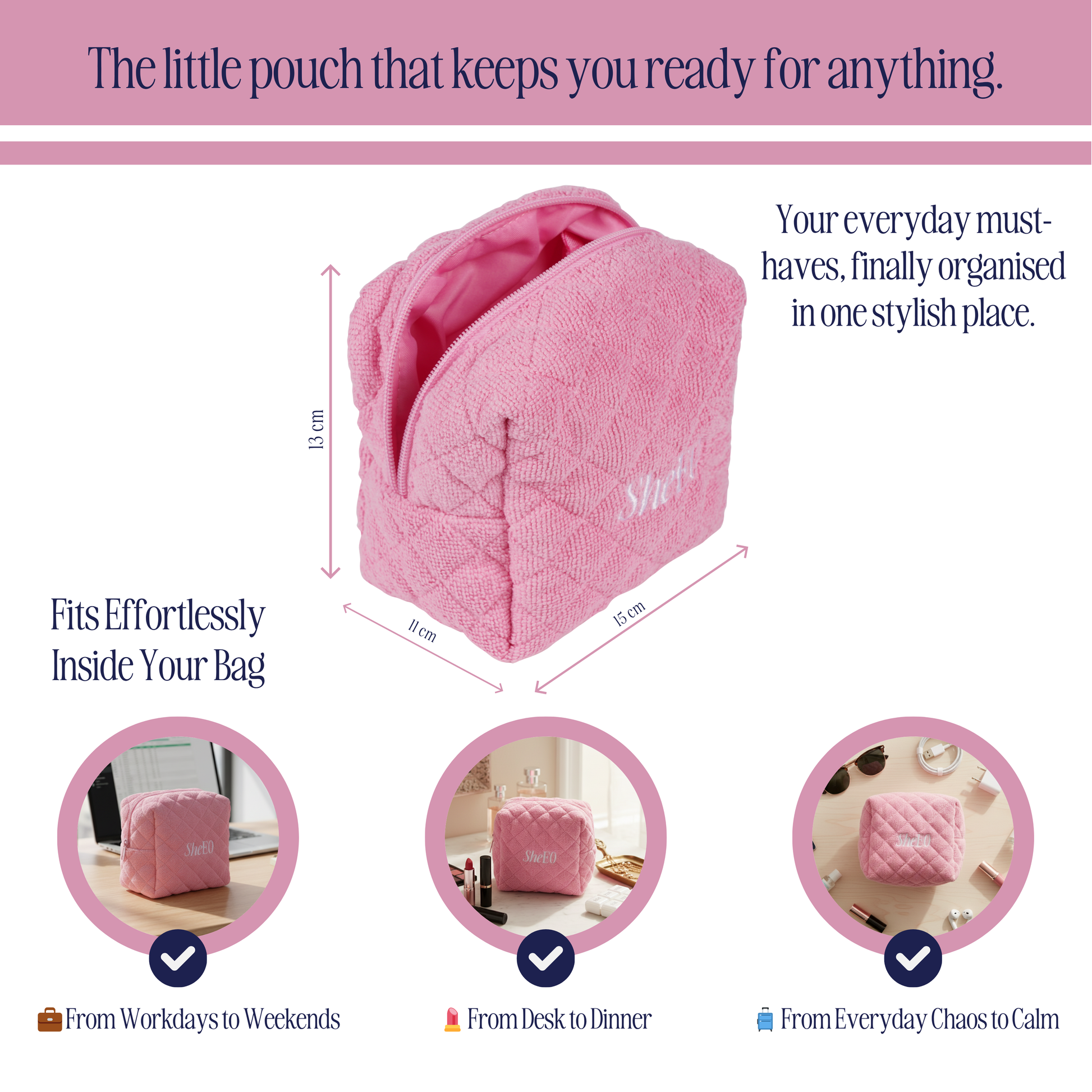 Meet the SheEO SOS Pouch: your everyday lifesaver in blush pink towelling.