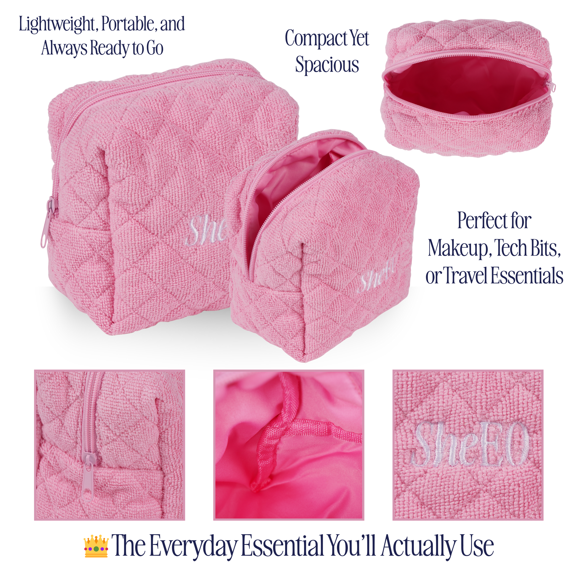 small pink makeup bag, luxury essentials pouch, towelling handbag pouch, tech pouch for women, blush pink mini bag, emergency pouch for handbag, SheEO accessories, everyday bag organiser, women's daily essentials pouch, compact makeup bag UK